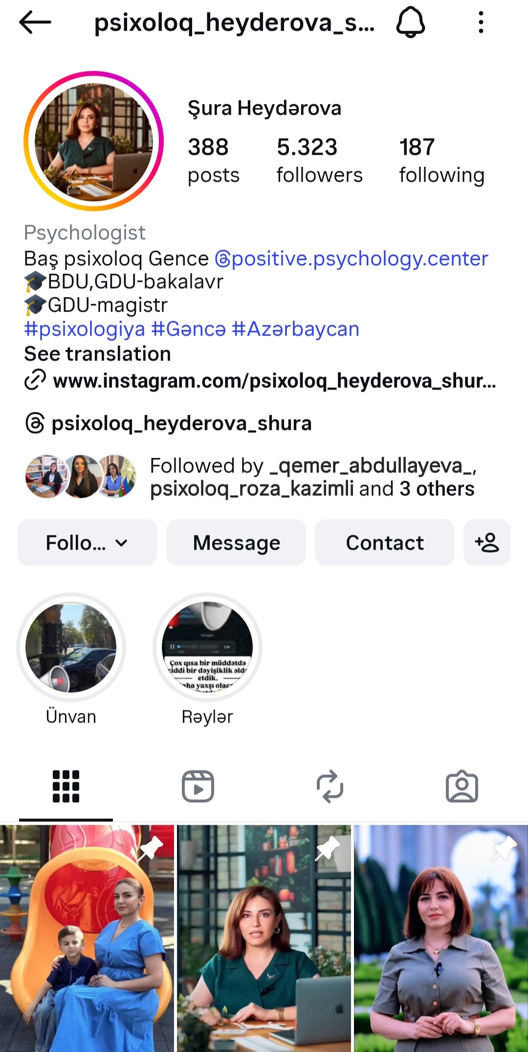 Sonda psixoloq Şura Heydərovanın instagram səhifəsini də sizə təqdim edirik: